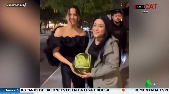 Justo antes de asistir al conocido programa, la catalana fue sorprendida por una artista conocida por recrear las caras de los famosos en sandías. En su momento, la joven ya le regaló una a Shakira y, ahora, ha hecho lo propio con Rosalía. "Parece que le ha puesto paperas", destaca Alfonso Arús, que insiste en que ve a Rosalía con la cara "hinchada" en la sandía. Por su parte, Angie Cárdenas y Tatiana Arús afirman que a ella se les parece más a Frida Kahlo.