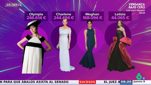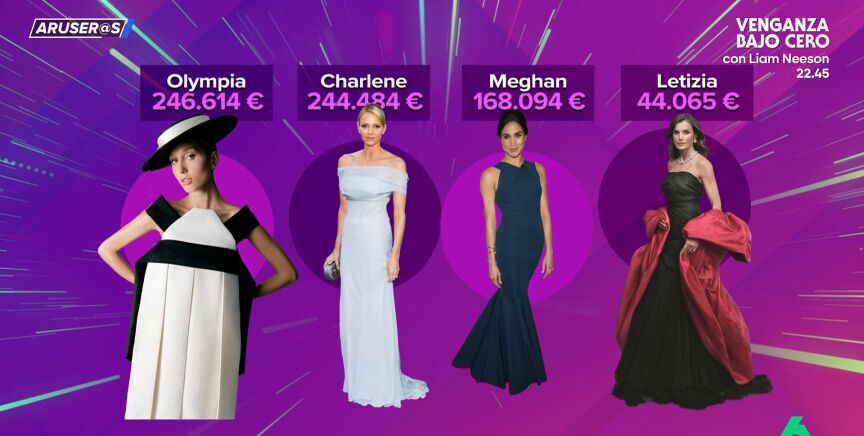 "No son apariciones como la reina Letizia sino eventos más de marcas de lujo o alfombras rojas", explica Tatiana Arús, que destaca que "el valor medio de la ropa que usa Olimpia de Grecia es de 3.474 euros". Por su parte, Charlene de Mónaco "ha invertido 244.484 euros, solo 2.000 euros menos, pero Charlene ha lucido más prendas". Además, cada prenda de Charlene cuesta una media de 1.910 euros. Por su parte, Meghan Markle "ha gastado 168.094 euros en ropa y ha estrenado 207 prendas, cuyo precio medio es de 858 euros".