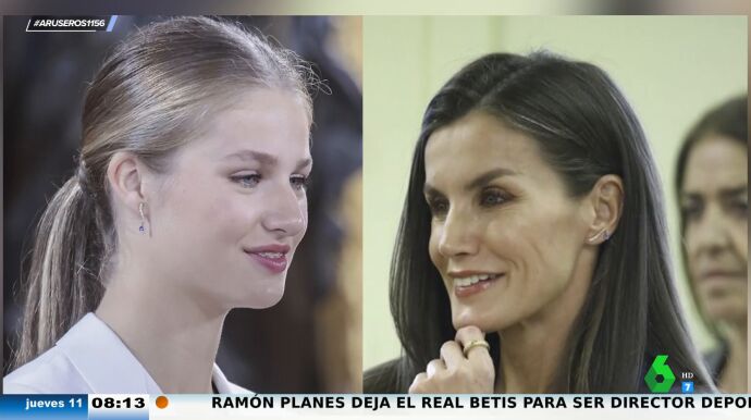 Por otro lado, la reina sorprendió luciendo unos pendientes en oro rosa que en su momento había llevado la princesa Leonor en la Jura de la Constitución. "Vemos que le ha dado un estilo diferente", explica Tatiana Arús, que destaca que "en el caso de Leonor lucía la piedrecita colgando hacia abajo mientras que la reina Letizia lo llevó hacia arriba, con un estilo algo más moderno".