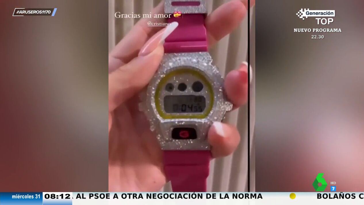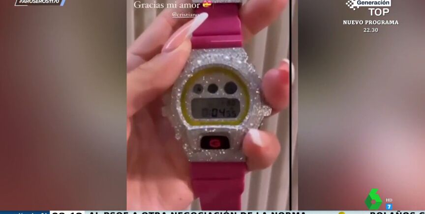 Y es que tras su viaje a Maldivas con sus amigos para celebrar su cumpleaños por todo lo alto, la modelo ha recibido de su pareja un reloj de lujo de color rosa con diamantes. Presuntamente, el reloj costaría 100.000 euros. "A simple vista pensaba que era el típico de juguete", destaca Tatiana Arús mientras que Alfonso Arús confiesa que "parece el de Hello Kitty". "Cuando he visto que ha etiquetado a Cristiano Ronaldo he visto que esto vale dinero", insiste la colaboradora.