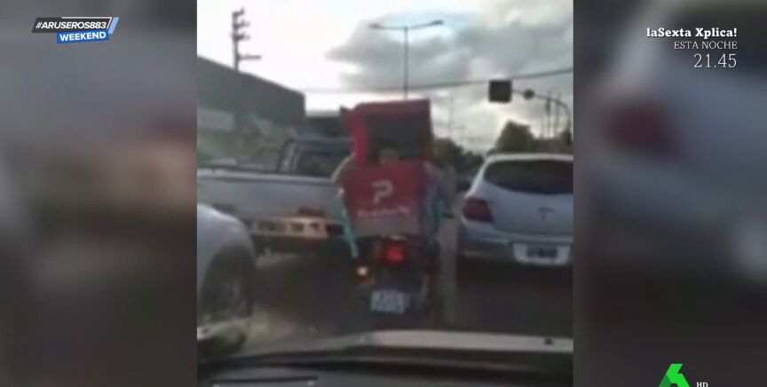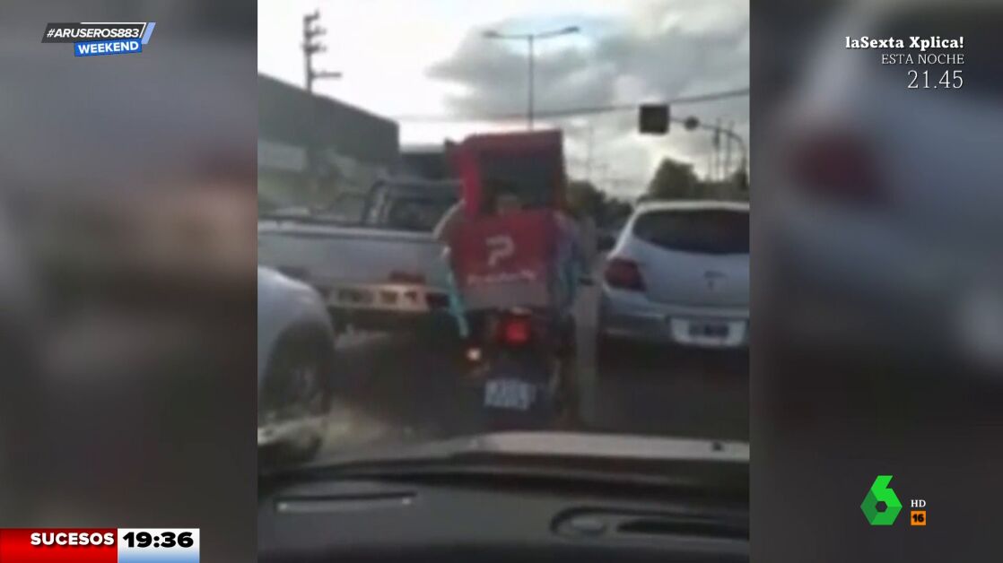 Las motos y los repartidores tienen mucha historia en el mundo de los vídeos virales. Caídas, entregas erróneas, sustos... La mayoría de estas escenas son graciosas, pero, en este caso, los colaboradores de Aruser@s Weekend se han quedado de piedra. ¿A quién se le ocurre llevar a un niño en el baúl de una moto de reparto? Sí, en el lugar donde se meten las pizzas o los documentos, un repartidor decidió llevar a un niño. No sabemos si se trata de su hijo u otro familiar. Los hechos han ocurrido en Buenos Aires, Argentina. Las imágenes se han hecho virales y en el país piden encarecidamente que se localice al repartidor para pedirle explicaciones por tamaña imprudencia que podría haber terminado muy mal.