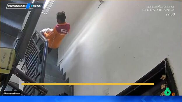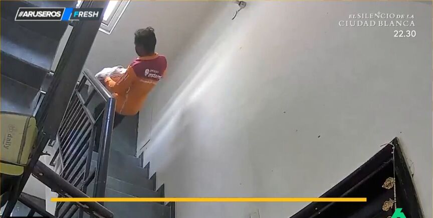 Un repartidor aprovecha la entrega de un paquete para robar unas zapatillas. El hombre llega a la puerta de casa de la mujer y entrega el paquete. Cuando la mujer cierra la puerta, sube y coge las deportivas.