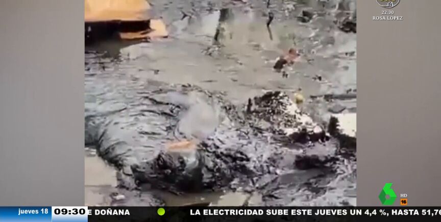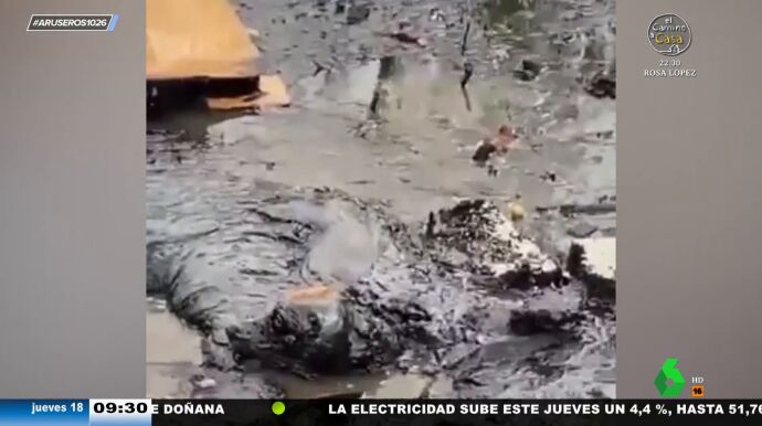 La operación de salvamento duró unos 60 minutos, informa Alfonso Arús en el programa. "Parece como si fuera alquitrán y como si estuviera metido debajo de esa capa, porque no hay manera de poderlo sacar a la superficie", comenta Angie Cárdenas.