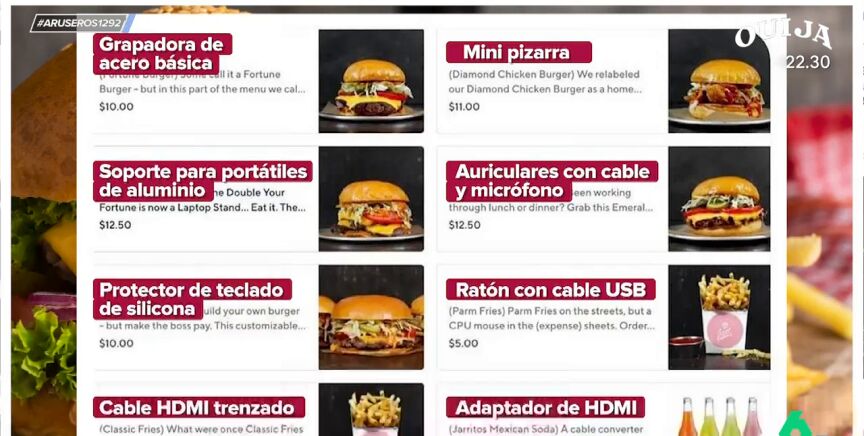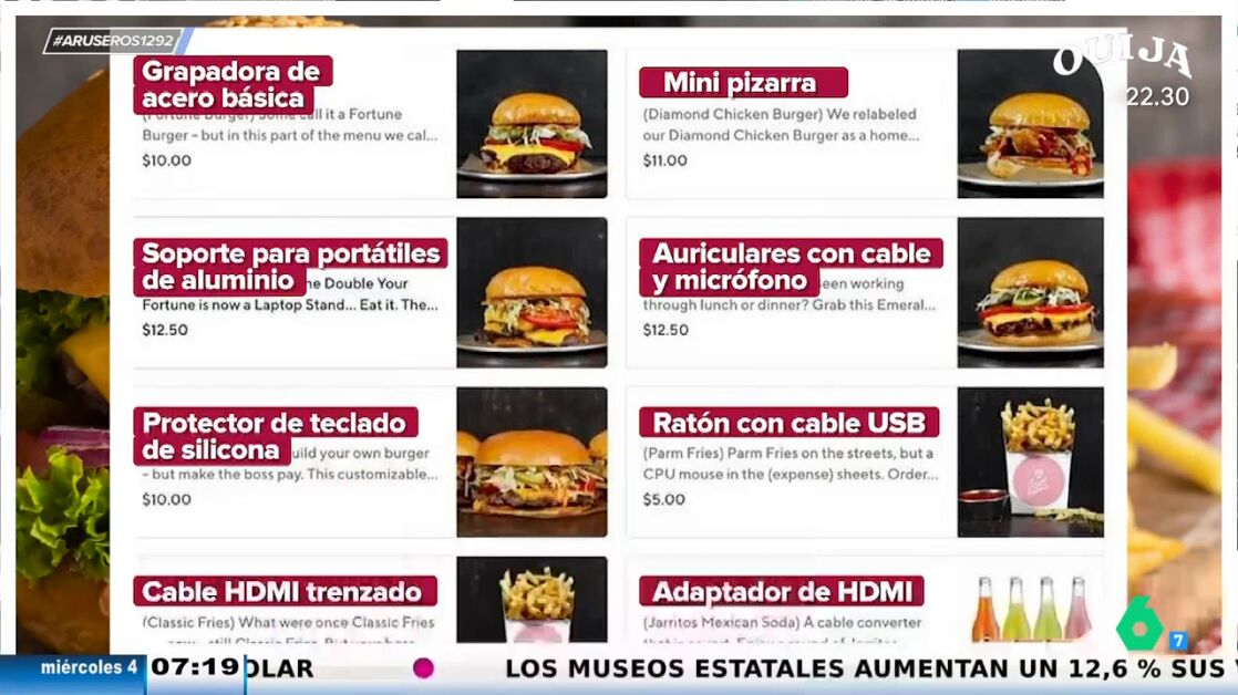 Así, encontramos que el 'Soporte para portátiles de aluminio' es en realidad una 'Double Fortune Burger' y el 'Protector de teclado de silicona', una hamburguesa hecha con los ingredientes elegidos por el cliente. El 'Cable HDMI trenzado' y el 'Ratón con cable USB' son patatas fritas. El 'Adaptador HDMI' son los refrescos.