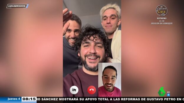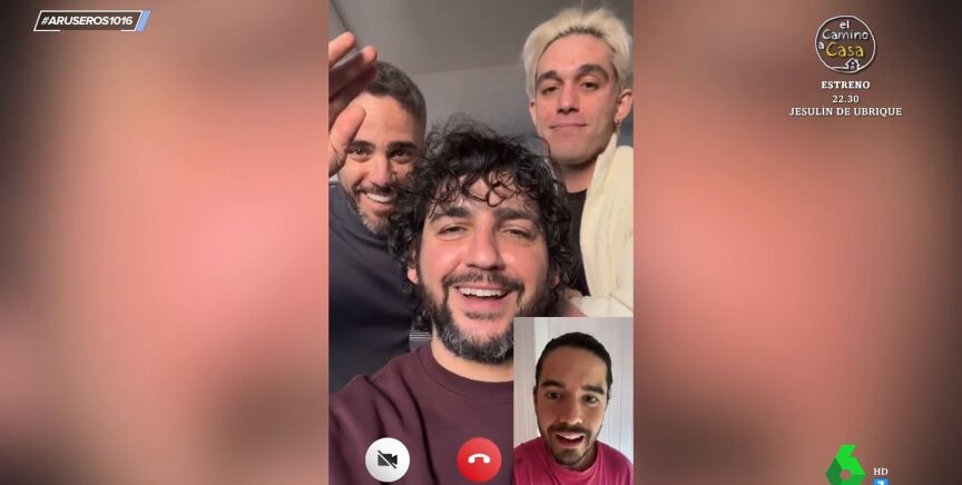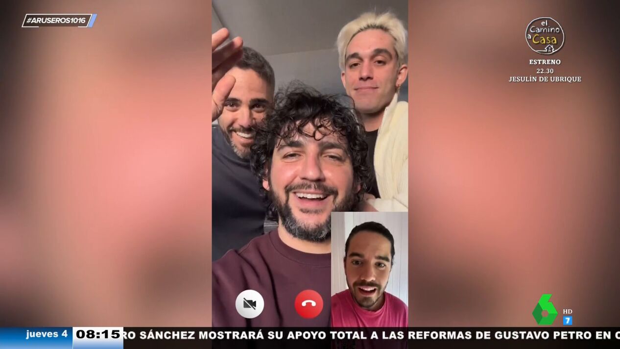 Tatiana Arús muestra en el plató de Aruser@s el vídeo viral en el queFran Perea y Víctor Elías desvelan que Roberto Leal se ha lanzado con ellos al mundo de la música. "Hay un chaval aquí", informa Fran Perea a través de una videollamada al cantante Roi Méndez. Justo en ese momento aparece el presentador por detrás del actor: "Roi, qué pasa, tío".