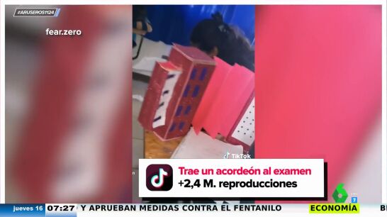 Por eso, se planta en el examen con un acordeón de los de toda la vida, pero no para amenizar el tiempo de la prueba con una alegre canción... aunque tampoco tenemos muy claro cuál es el objetivo, sinceramente.