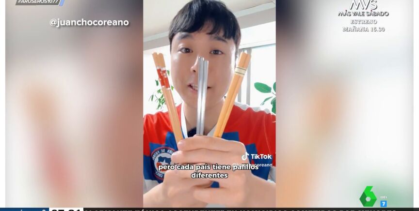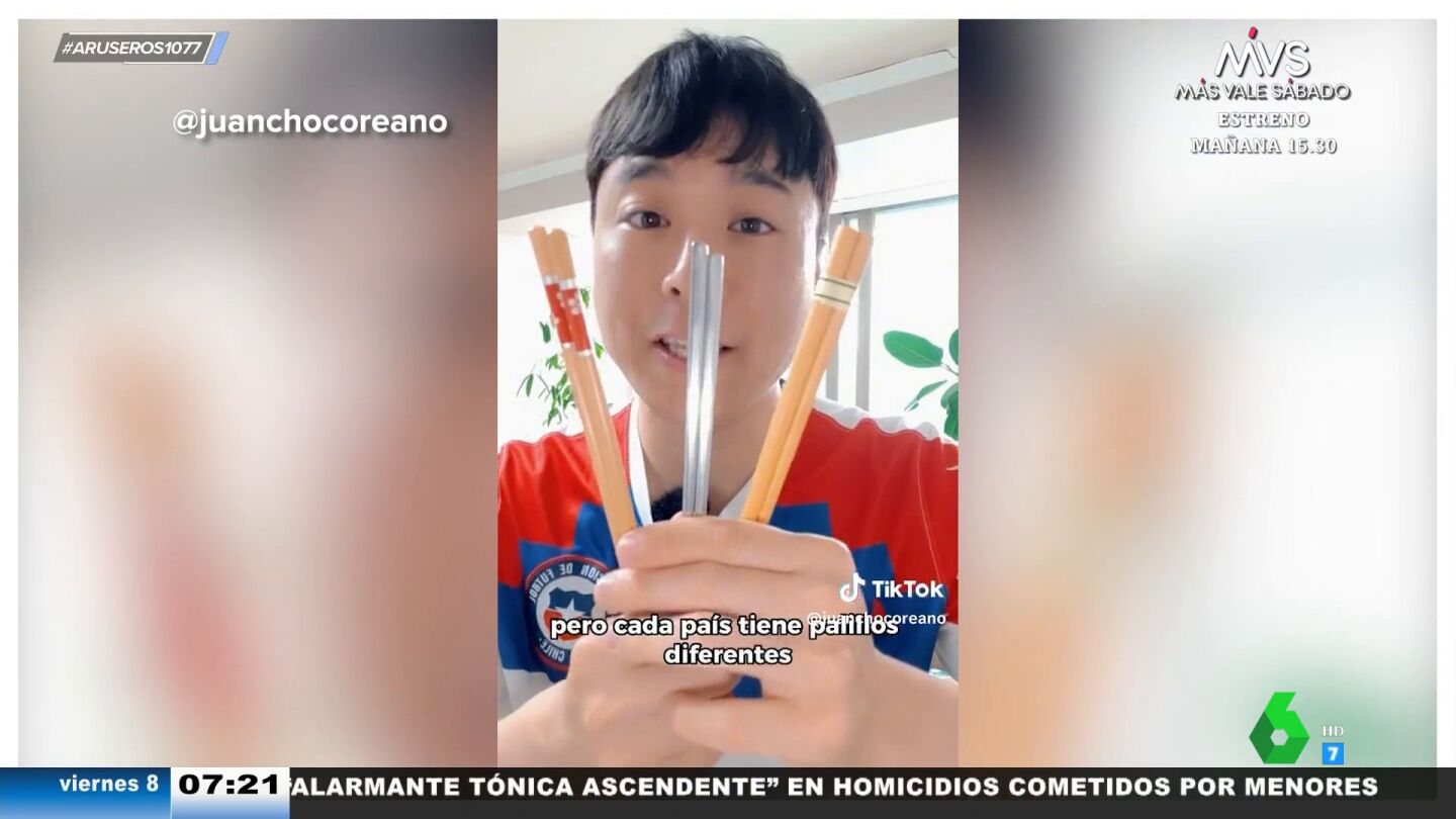 El usuario de Tiktok @JuanchoCoreano es el autor de este vídeo que se ha convertido en viral y del que hoy se hace Hans Arús en Aruser@s. Y es que, muchos no sabíamos que en Corea, China y Japón los palillos para comer son diferentes, ni mucho menos, los motivos de esta diversidad. "En China y en Corea tienen la cultura de comer compartiendo, por eso los palillos son más largos; pero en Corea, se usan los de metal". Incluso el uso del metal tiene su razón de ser. "Aquí en Corea se comen muchos banchan, un plato pequeñito, entonces es más fácil de escoger las cosas pequeñas".