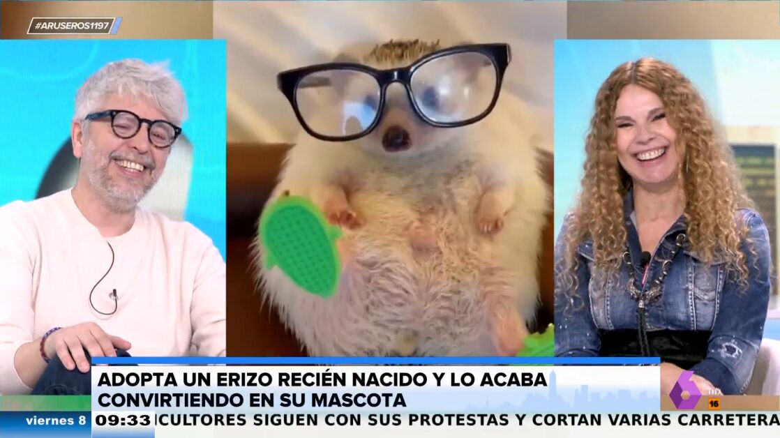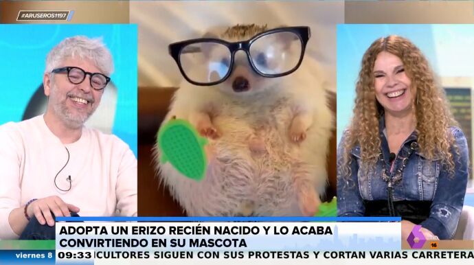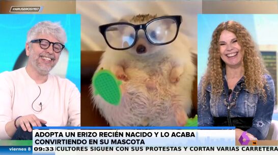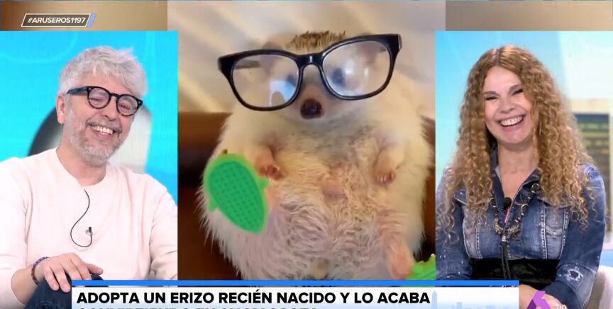 "¡Oy!", no puede evitar exclamar Angie Cárdenas en plató cuando ve al erizo acostado de lado, una de las imágenes más "cuquis" que ha visto en su vida. La colaboradora ríe a carcajadas cuando le ve sentado en un sillón hecho a su medida, con unas gafas de lectura y unas pantuflas puestas.