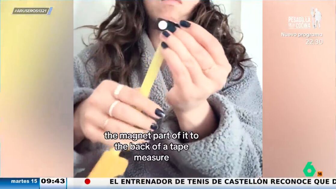 La chica utiliza solamente dos cosas: una cinta métrica y un imán. Coloca el imán en la punta del instrumento de medida y comienza a estirar hasta lograr que el imán haga contacto con los auriculares.