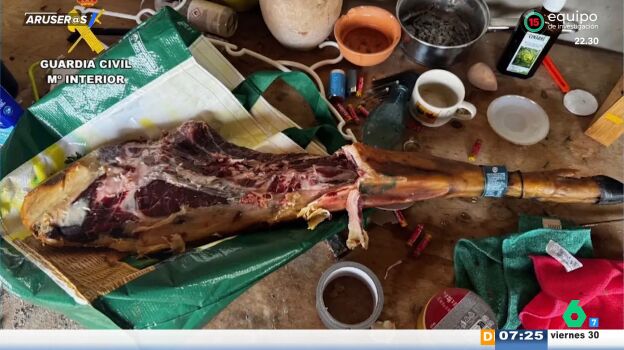 La fotografía, difundida por la propia Guardia Civil, muestra cómo una mujer devolvió a un supermercado un jamón ibérico de 420 euros completamente mordido. "La señora accede a devolverlo después de que los agentes recibieran una denuncia del supermercado alertando sobre el robo", explica la colaboradora de Aruser@s. Según relató un testigo a los agentes: "Creo que una señora se ha llevado un jamón bajo el abrigo".