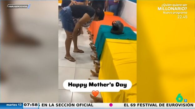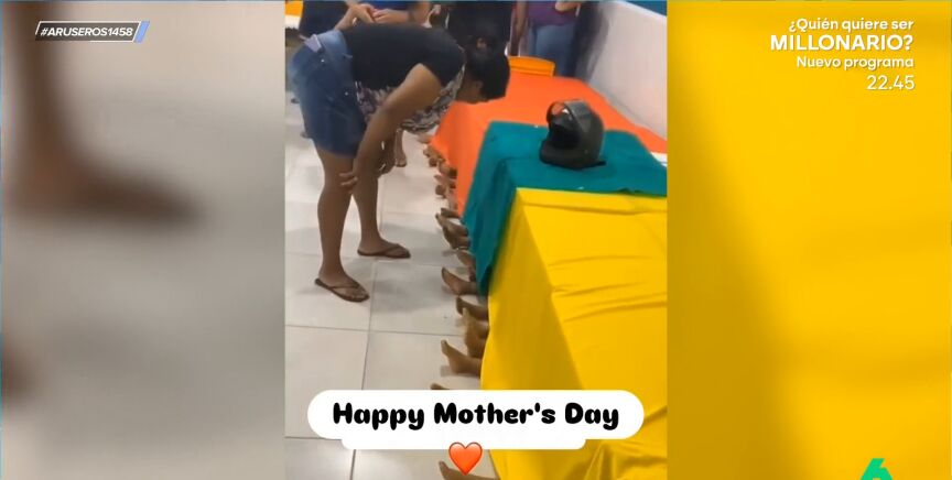 Ocultos bajo unas mesas con manteles de colores se encuentran sus hijos y por debajo de ellas solo sobresalen los pies. Las mujeres tienen que descubrir quién de todos ellos es su pequeño solo con verle las uñitas (y los callos).