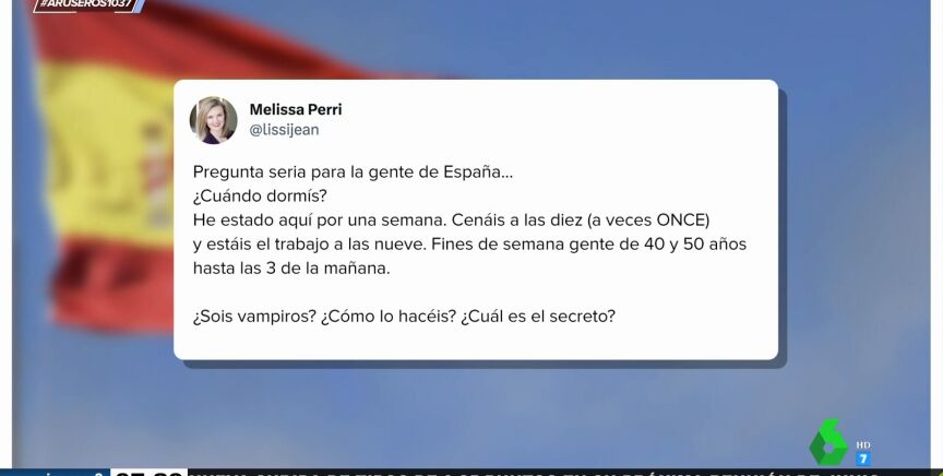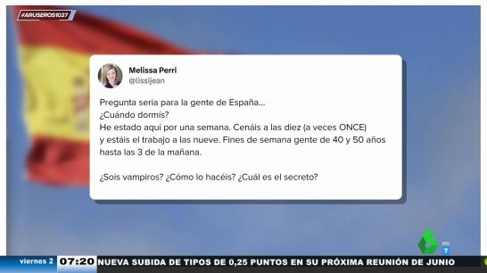 "¿Sois vampiros? ¿Cómo lo hacéis? ¿Cuál es el secreto?". Son las preguntas que nos hace una mujer estadounidense que ha estado de visita en España durante una semana a través de Twitter. La chica ha vuelto a su país natal alucinada con nuestros horarios y costumbres, sobre todo con el hecho de que, según ella, dormimos muy poco.