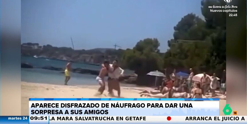 El hombre que aparece disfrazado de náufrago llevaba mucho tiempo sin ver a sus amigos, por lo que decidió sosprenderlos apareciendo en la playa en la que se encontraban. Al estar caracterizado de esa manera, era prácticamente imposible que sus amigos lo reonocieran. "El riesgo de que le pegasen un guantazo esta ahí", comenta David Broc.