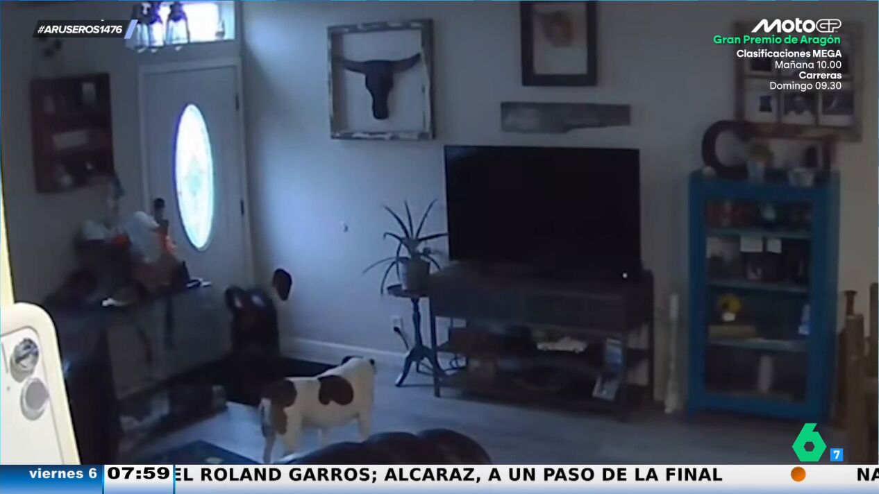 Como vemos en estas imágenes captadas por una cámara de seguridad, los dos perros juegan, bastante a lo bruto, en el salón y llega un momento en el que la 'pelea' se les va de las patas.