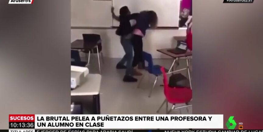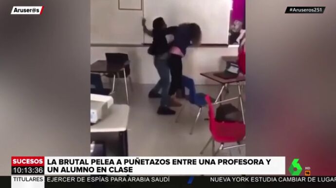 En las imágenes se ve cómo el alumno de 16 años empuja a la profesora y esta, lejos de achantarse, le tira al suelo. Una vez que el joven se levanta, comienza un intercambio de golpes por el aula mientras el resto de alumnos se apartan de su camino.