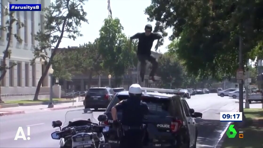 Arusitys muestra las surrealistas imágenes en las que un joven de 23 años decide subirse en un coche patrulla y saltar sobre él, poniendo a prueba la paciencia de los agentes de la Policía que tuvieron que esperar hasta media hora para detenerle.