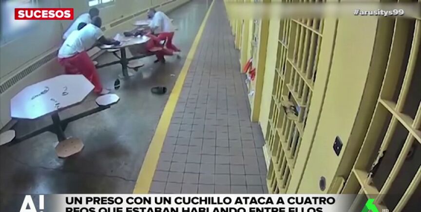 En este vídeo se muestra cómo un preso apuñala con un cuchillo a otros cuatro reos que estaban esposados a una mesa y hablando entre ellos en una cárcel de Estados Unidos.