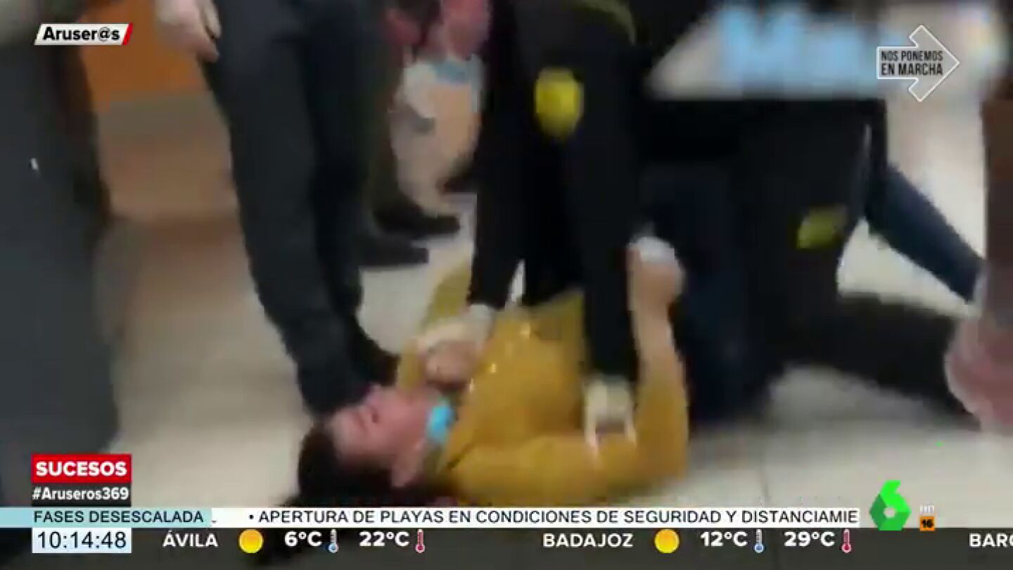En ese momento, varios compañeros intentan separarlas sin éxito hasta que el que el vigilante de seguridad consigue reducir a la clienta en el suelo. Pero en un descuido, la mujer coge unas cestas de la compra y las lanza contra el encargado a la vez que pide "socorro" entre gritos.