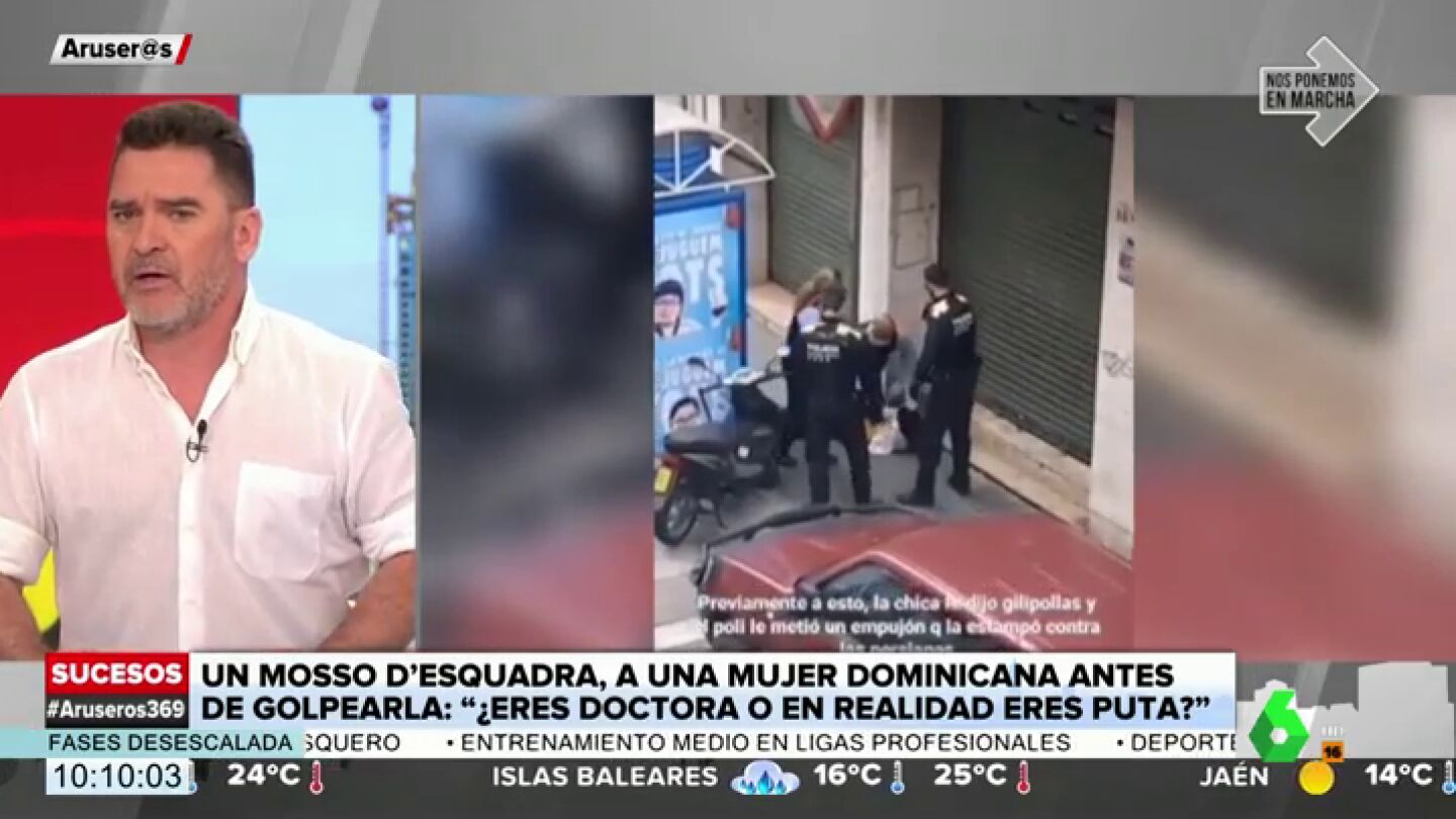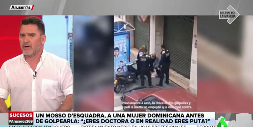 En las imágenes grabadas por los vecinos, se puede ver el momento en el que agentes de los Mossos d'Esquadra detienen a la mujer dominicana cuando regresaba a su casa, a pesar de tener el documento acreditativo de la empresa donde trabaja, según informa y muestra en pantalla Carlos Quílez.