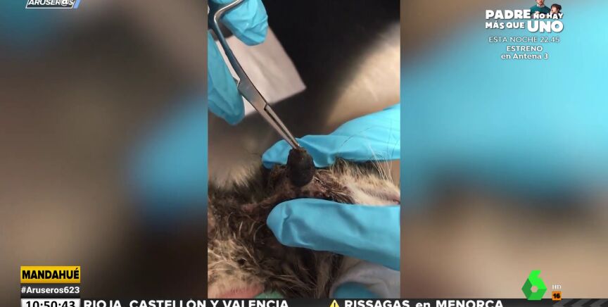 Alfonso Arús ha mostrado en Aruser@s la actuación de un grupo de veterinarios para extraer un insecto de grandes dimensiones a un pequeño gatito.