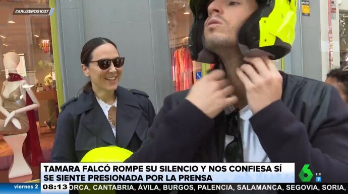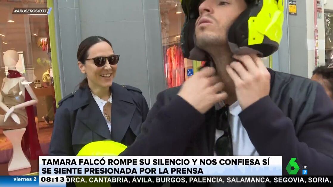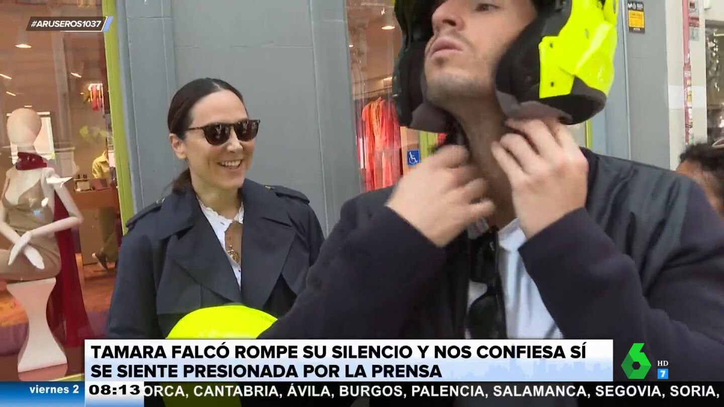 "Te presionamos mucho", reconoce una de las redactoras que entrevista en plena calle a Tamara Falcó, que está a punto de montarse en la moto con su novio. "¿Vosotros qué créeis?", pregunta ella, eso sí, con una sonrisa. "Un poquito, un poquito", dice con cierta ironía.