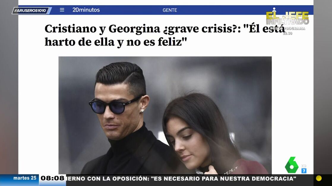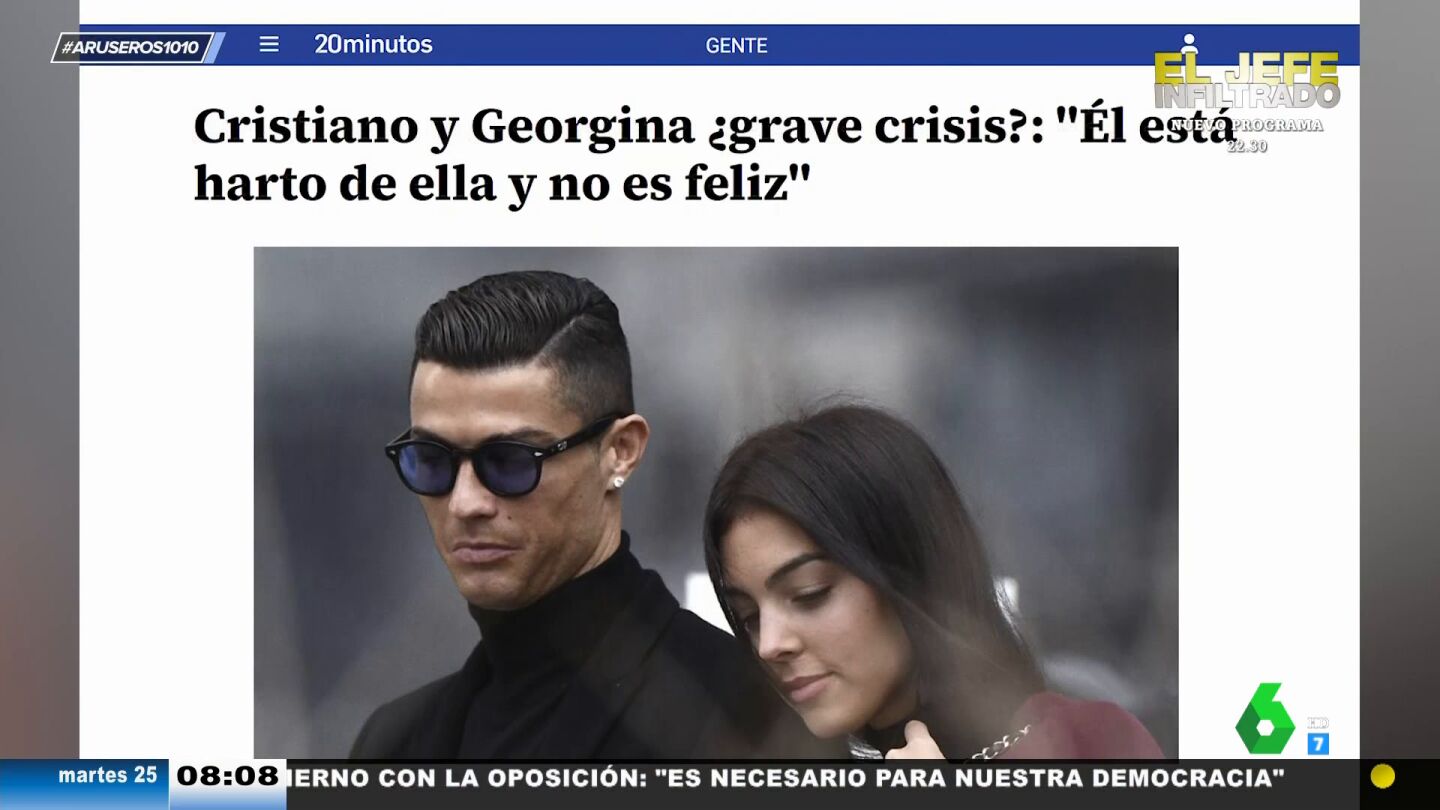 Tatiana Arús analiza en el plató de Aruser@s los rumores de que Cristiano Ronaldo y Georgina Rodríguez estarían atravesando una mala época por las exigencias de la modelo. "Como apuntan algunos medios, Cristiano estaría algo molesto con Georgina por pasarse el día en el centro comercial", explica la colaboradora, que destaca que la joven lleva un mes sin compartir una imagen junto al futbolista en sus redes sociales.