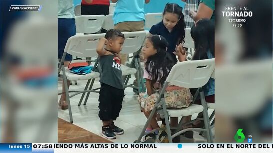 El pequeño se levanta las mangas de la camiseta para mostrar sus bíceps y enseñar músculos a unas amigas que estaban sentadas hablando entre ellas. Los tertulianos de Aruser@s comentan esta jugada que demuestra la confianza de este niño.