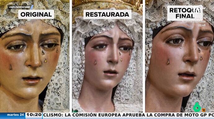 "A la Macarena le han hecho un crimen. A ver dónde están los criminales, porque alguien la ha tenido que matar. Nos la han robado, nos la han asesinado. ¿Y dónde están esos asesinos? Que busquen a los asesinos y los maten", clama una señora en Canal Sur tras la polémica restauración de la Macarena que se ha convertido en viral en los últimos días.