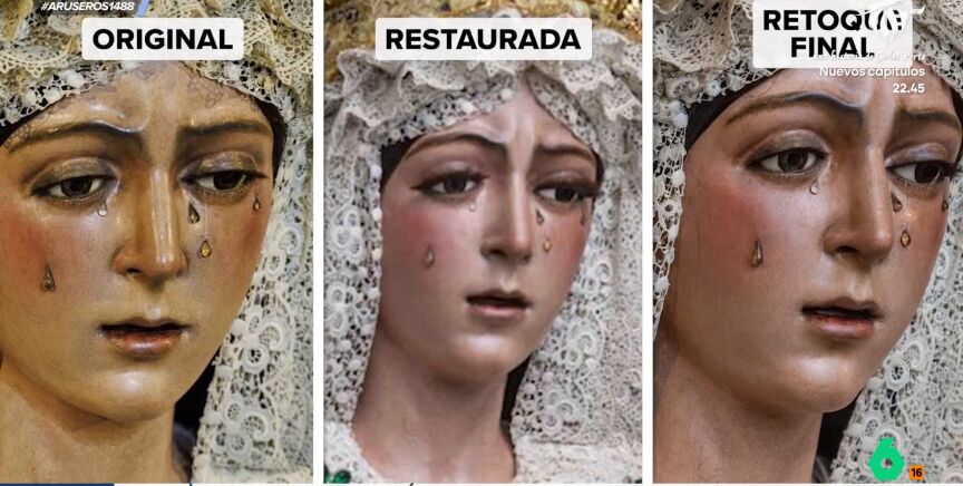 Tras contemplar el vídeo de una señora sevillana quejándose del "asesinato" que han perpetrado contra su Virgen Macarena, en el plató de Aruser@s analizan al detalle esta polémica restauración.