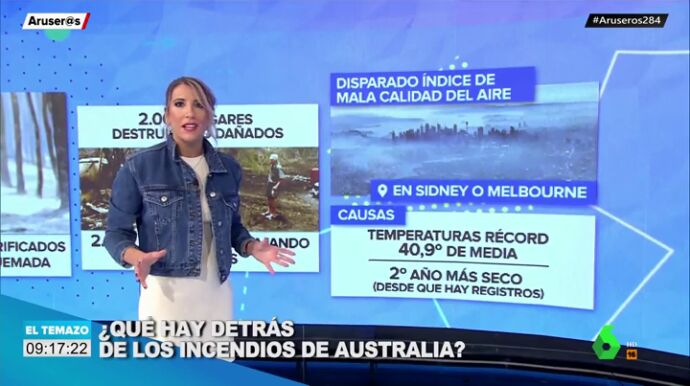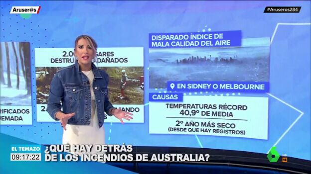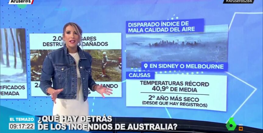 Alba Sánchez hace un repaso en este vídeo de la dramática situación que se está viviendo en Australia. Ya son 27 las personas que han fallecido, 1.000 millones de animales los que han muerto y 10,3 millones de hectáreas las que han sido devastadas en unos incendios que tienen 130 focos activos.