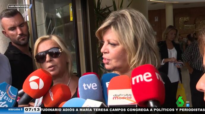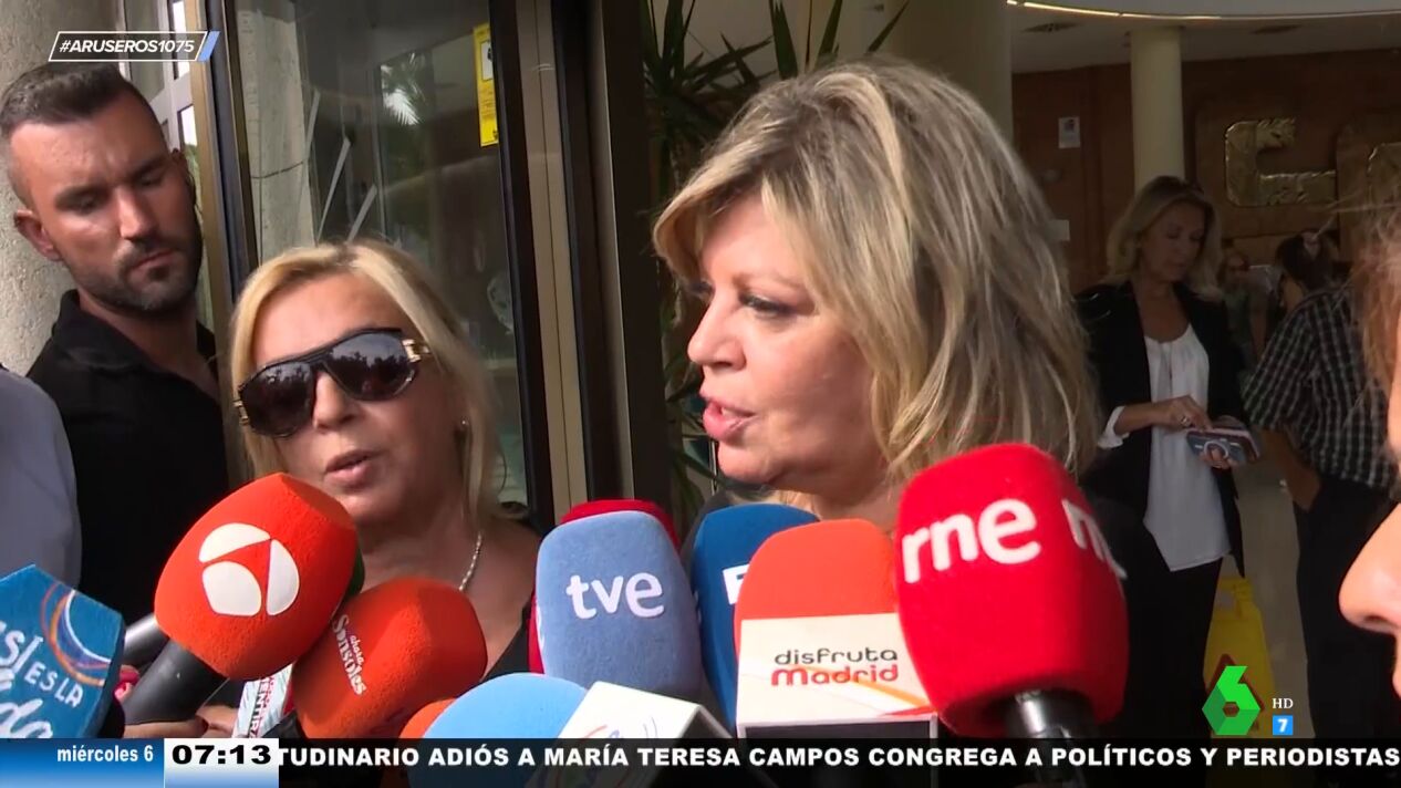 A las puertas del tanatorio de La Paz de Tres Cantos (Madrid), donde se instaló la capilla ardiente de María Teresa Campos, sus hijas, Terelu Campos y Carmen Borrego hablaron con los medios por primera vez tras el fallecimiento de su madre. "Ella ha sido la maestra de muchos de vosotros", apuntaba Terelu, con una media sonrisa, a los periodistas allí presentes.