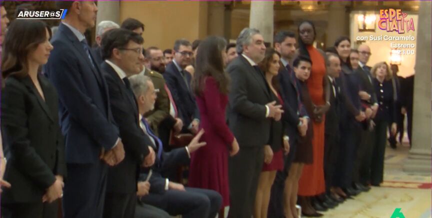 En el vídeo se puede ver cómo el rey Felipe tienen que llamar la atención de la reina Letizia dándole un toque en el vestido para que se siente y así dar comienzo al acto.