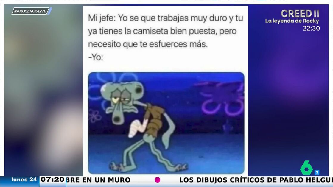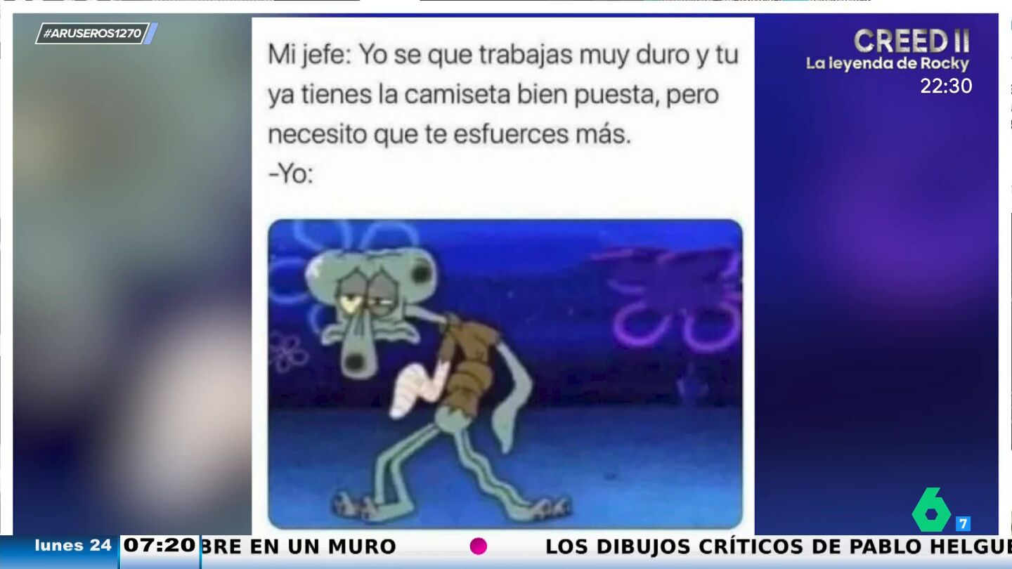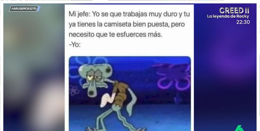 Un hombre es despedido tras subir un meme a su estado de WhatsApp. A pesar de tener la baja el hombre continuaba yendo a trabajar. "Mi cliente sube un meme en el que da a entender que está cansado y enfermo", explica la abogada, que cuenta que "en el momento que el empleador lo ve, le despide porque considera que le está faltando el respeto".