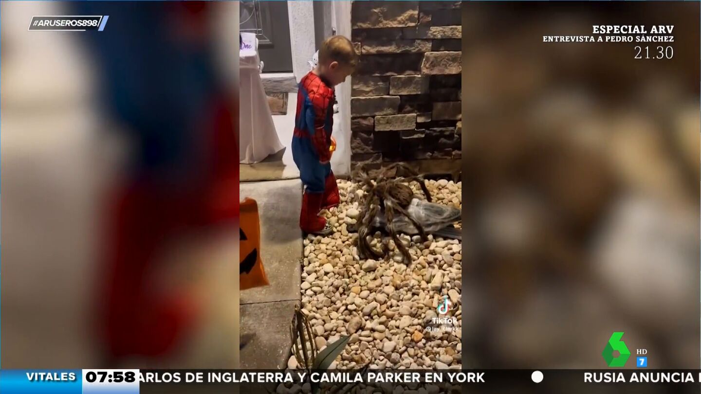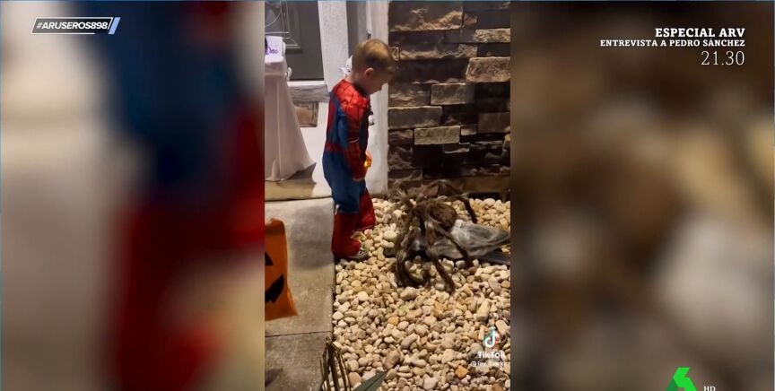 El niño que vemos en este vídeo de Aruser@s se disfrazó este pasado Halloween de su superhéroe favorito, que no es otro que el mismísimo Spider-Man. Con su cubo con forma de calabaza en la mano repleto de caramelos, se acerca con cuidado a la gigantesca araña de juguete que reposa entre la decoración de esta casa.