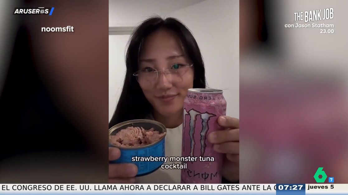 Los colaboradores de Aruser@s reaccionan con incredulidad a una curiosa mezcla nutricional que se ha hecho viral en redes sociales: mezclar una bebida energética sabor fresa con una lata de atún.