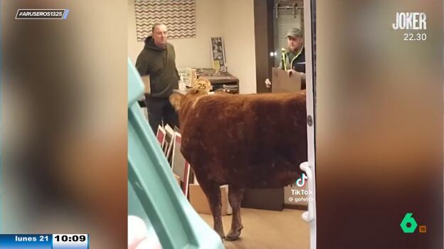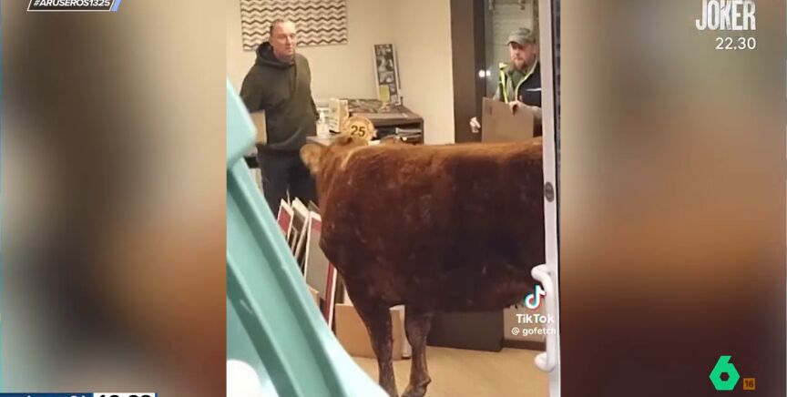 Las cámaras de seguridad de una tienda de pinturas captan a una vaca entrando al negocio. El animal se cuela dentro y da una vuelta por el comercio muy tranquila, no embiste ni tira nada. El problema para la res llega cuando quiere salir y se da cuenta de que no sabe cómo.