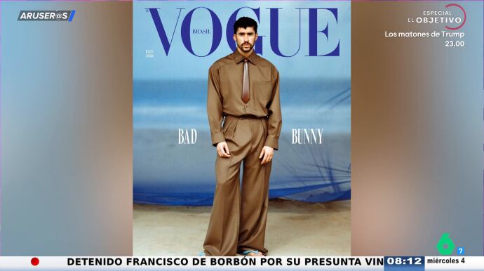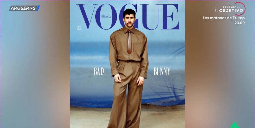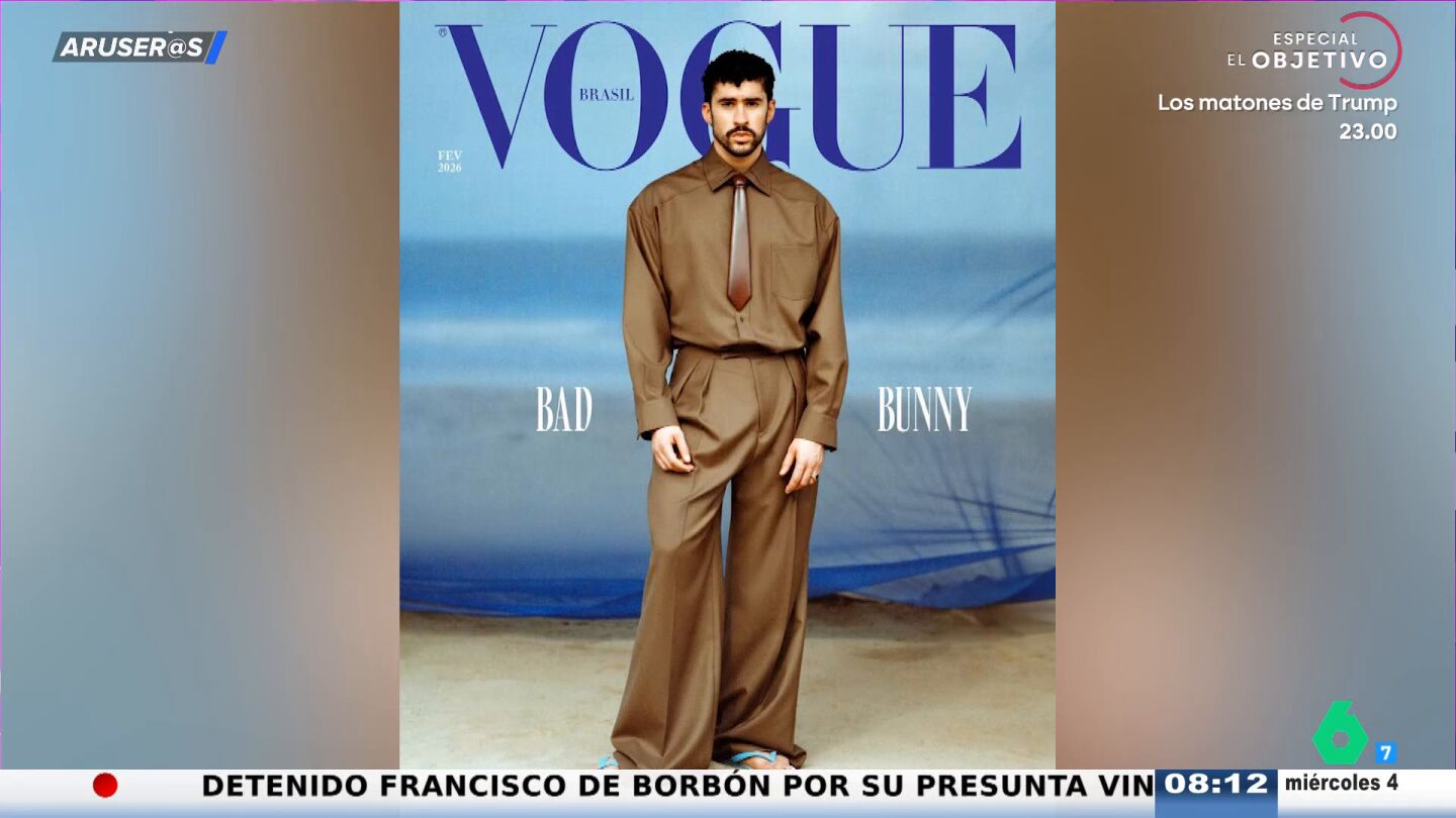 Bad Bunny protagoniza la portada de la revista 'Vogue' de febrero como icono de la moda masculina. "Un señor que sale con unos pantalones imposibles y unas chanclas", destaca Alfonso Arús en el plató de Aruser@s, donde Tatiana Arús enseña el resto de imágenes: "Si vemos el resto del reportaje también aparece con una camiseta de manga corta y un sombrero de paja".