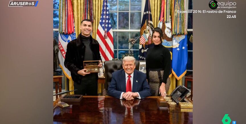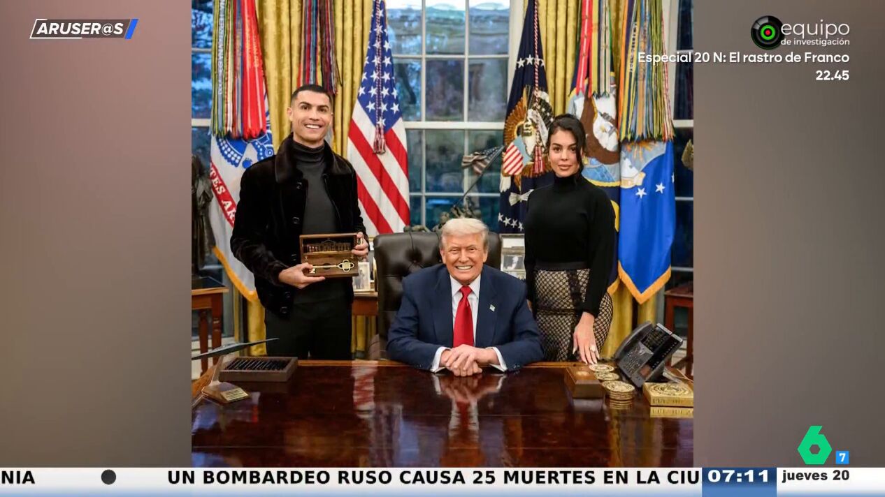 La modelo ha elegido un vestido vintage que ya llevó Hilary Swank en 2005 para recoger su Oscar por 'Million Dollar Baby'. "Se puede adquirir en una conocida tienda de Londres", explica Tatiana Arús, que enseña cómo Cristiano Ronaldo y Georgina Rodríguez se miran en el espejo del ascensor antes de reunirse con Trump: "Georgina hace una última revisión de su espalda y su culete para ver que está todo perfecto".