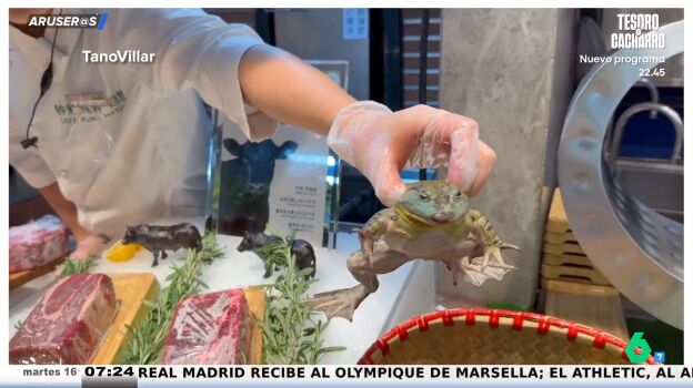 "¡Qué barbaridad! Una tortillita española con un jamón serrano", alucina el youtuber, hasta que, de pronto, algo le llama aún más la atención: "¿Qué locura es esto?, ¿por qué hay ranas vivas?".