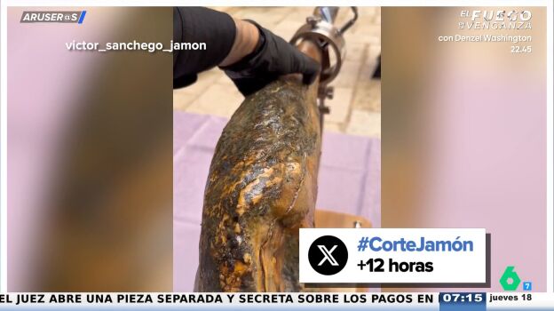 Se trata de Víctor Sanchego, un profesional cortador de jamón que muestra su maestría para cortar el jamón. Nada que ver con el profesional maestro del jamón de Disneyland París, a quien Alfonso Arús anima a que vea el vídeo.