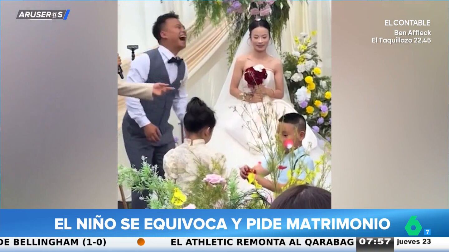 Alfonso Arús presenta en Aruser@s un divertido viral ocurrido durante una boda, donde el pequeño encargado de llevar las alianzas decidió arrodillarse ante su compañera para pedirle matrimonio.