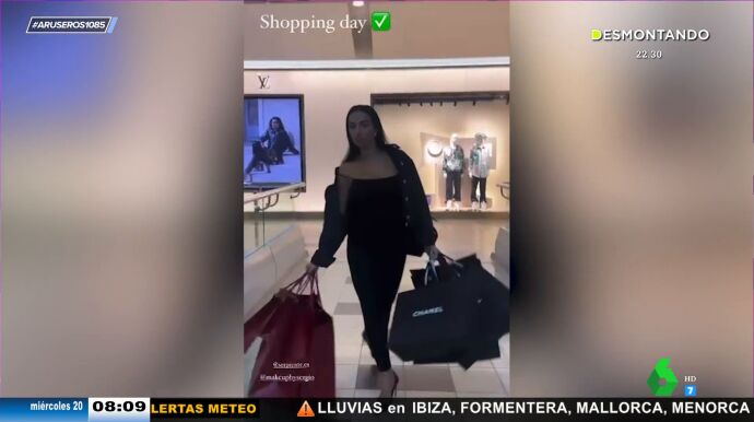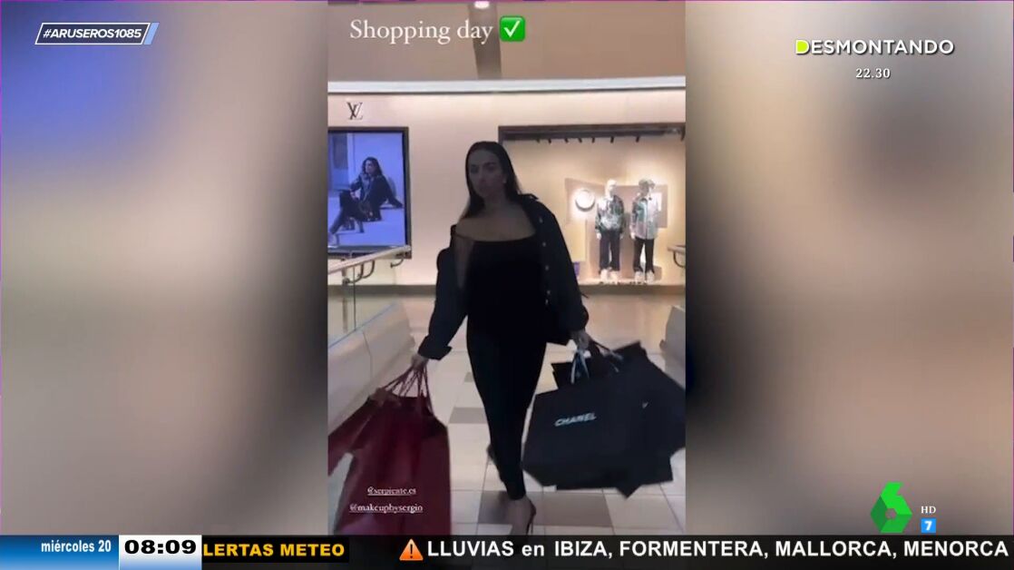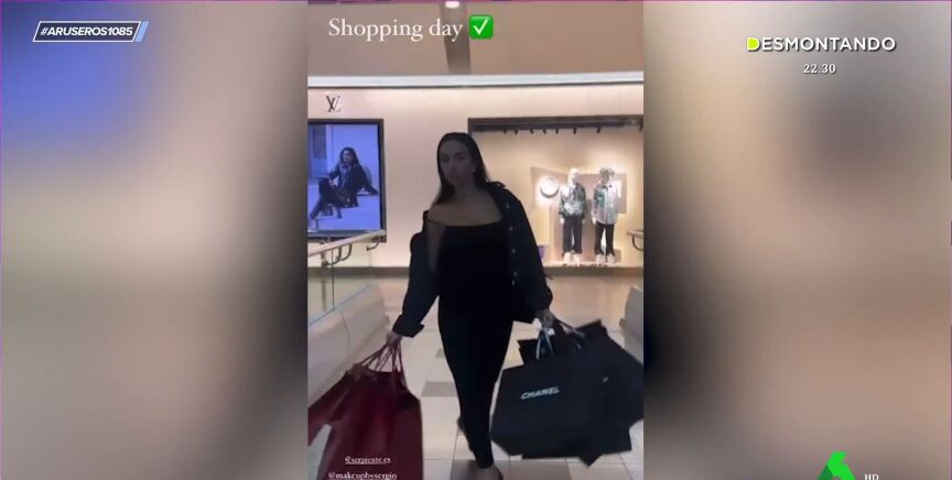 Alfonso Arús enseña en el plató de Aruser@s "el modesto día de compras" de Georgina Rodríguez, quien ha compartido unos vídeos en sus cuentas en redes sociales cargada con bastantes bolsas. "Es Pretty Woman", bromea Angie Cárdenas mientras Alfonso Arús afirma que "no es normal que sea ella la que lleve todas las bolsas".