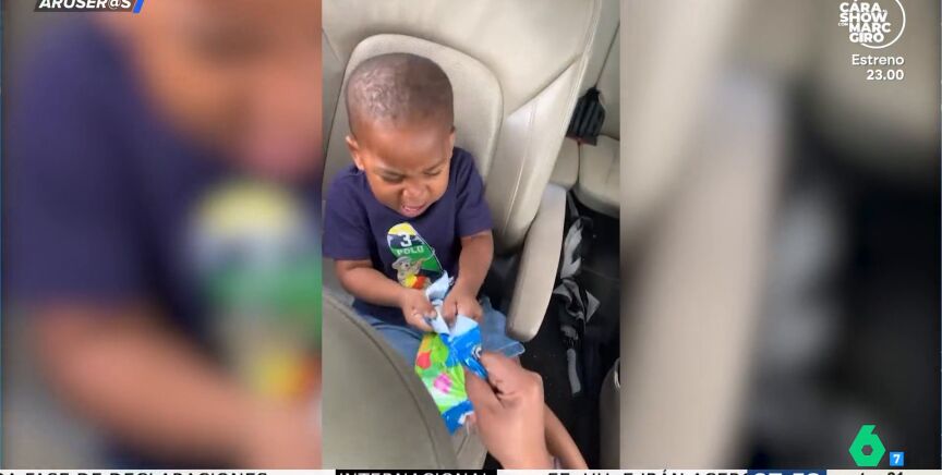 Como se ve en el vídeo sobre estas líneas, el pequeño se toma un berrinche y comienza a gritar mientras, enfurecido, no deja que su padre le quite la bolsa que sujeta entre las manos. "Hace todo el esfuerzo posible, incluso pega manotazos para que no le quite la bolsa, ¡vara cara pone!", alucina Hans Arús.