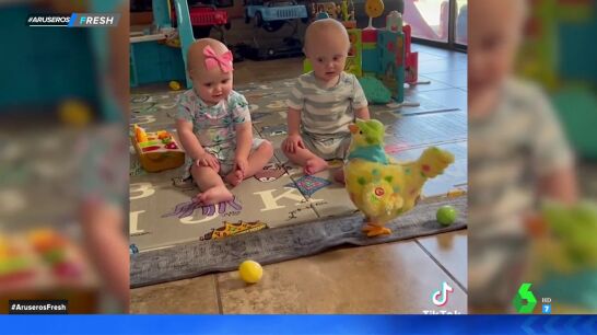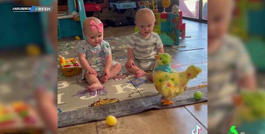 Como puede verse en el vídeo que acompaña a estas líneas, los dos pequeños están sentados en el suelo contemplando a la gallina. Todo parece divertido hasta que sale el primer huevo. En ese momento, uno de los bebés se queda completamente estupefacto. Su gestualidad ha provocado las carcajadas de los colaboradores de Aruser@s. "¡Está flipando!", ha apuntado María Moya.