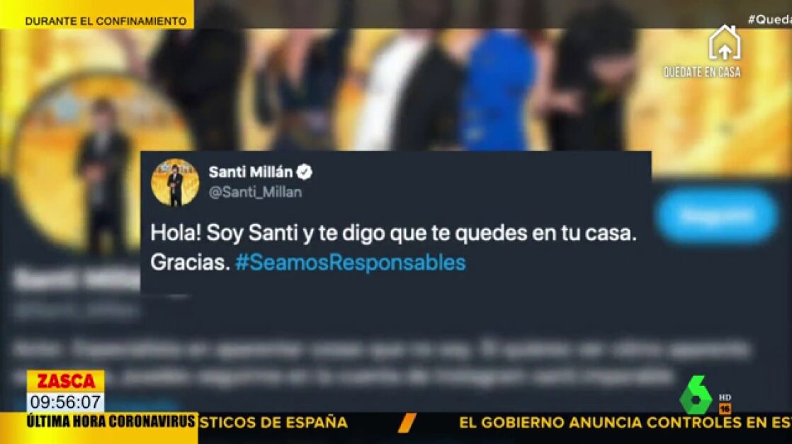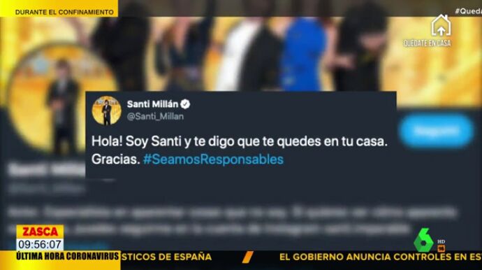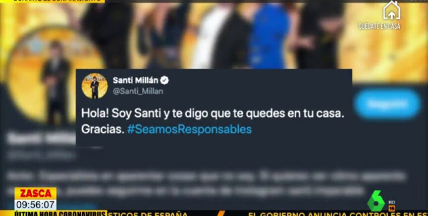 El joven hace referencia a al líder de Vox Santiago Abascal. Sin embargo, ha sido Santi Millán el que le ha respondido de forma contundente en Twitter. "Hola! Soy Santi y te digo que te quedes en tu casa. Gracias", ha comentado el actor con el hashtag #SeamosResponsables.