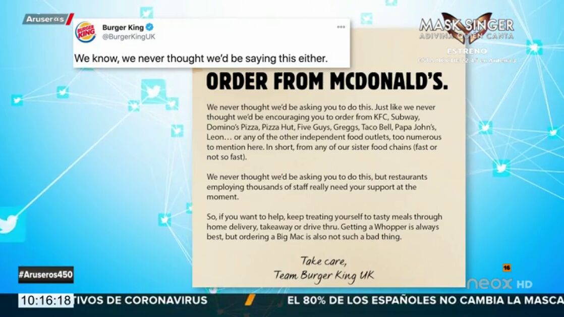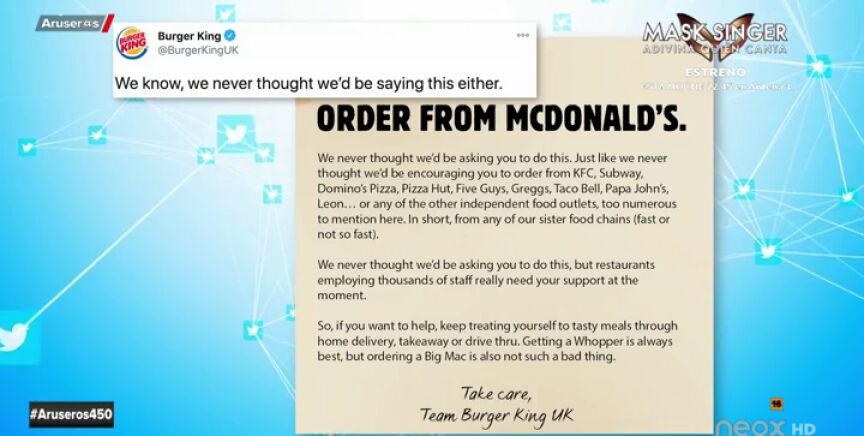 Por ello, la gran cadena de restauración ha querido echar una mano a sus competidores pidiendo a sus seguidores 'ayuda' e invitando no sólo a comer sus tradicionales Whopper; también la hamburguesa clásica de McDonaldis: "Pedir una Big Mac tampoco está tan mal", dice el mensaje. Una campaña que rápidamente se ha hecho viral y que incita a reflexionar en estos tiempos tan complicados en los que los bares, restaurantes etc... están siendo uno de los principales perjudicados.