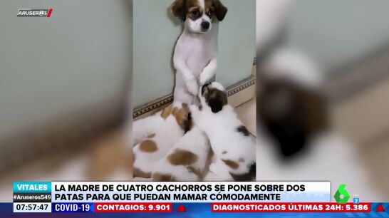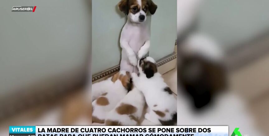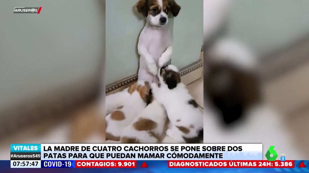 La emotiva imagen de una perrita alimentando a sus cachorros a dos patas