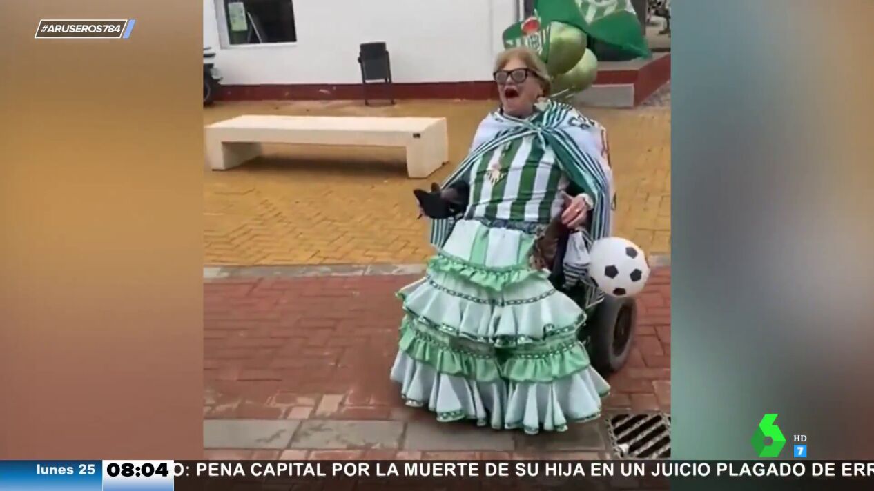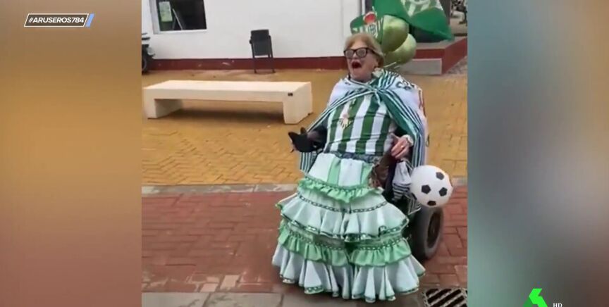 Como se muestra en el vídeo principal, una mujer en silla de ruedas apareció ataviada con un vestido de flamenca con los colores del Betis, una bandera del equipo, una medalla, una peineta con el escudo y varias banderas. De esta guisa, recorrió varios metros y fue grabada mientras gritaba: "Hasta el tanga lo tengo verde".