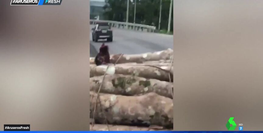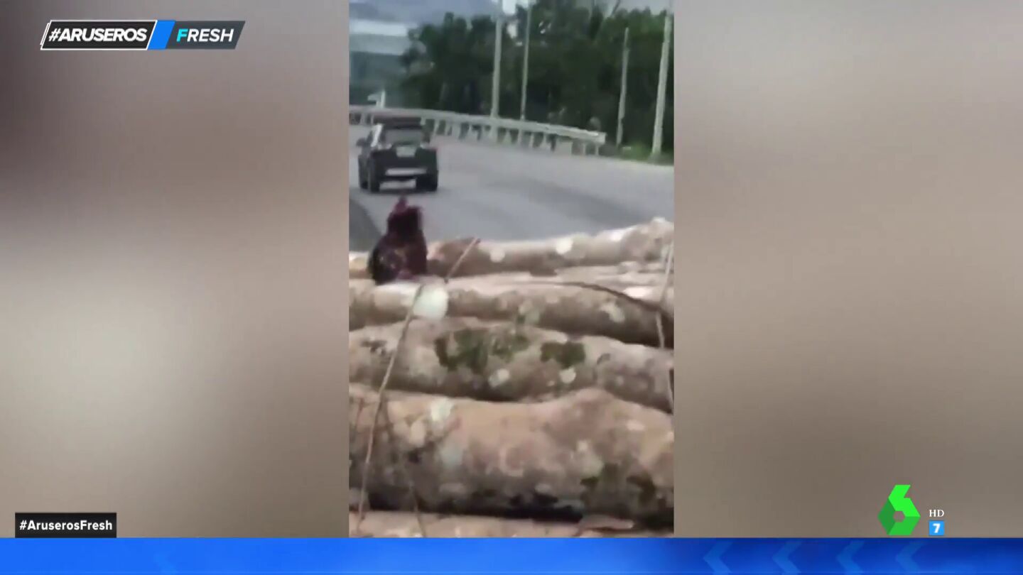 Unos conductores se quedaron muy sorprendidos al ver cómo un gallo apareció entre los troncos que cargaba un camión en marcha. El animal, lejos de desequilibrarse, parecía muy cómodo.