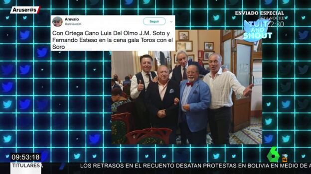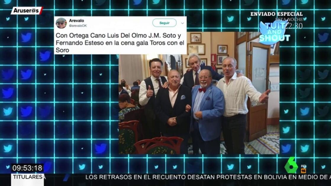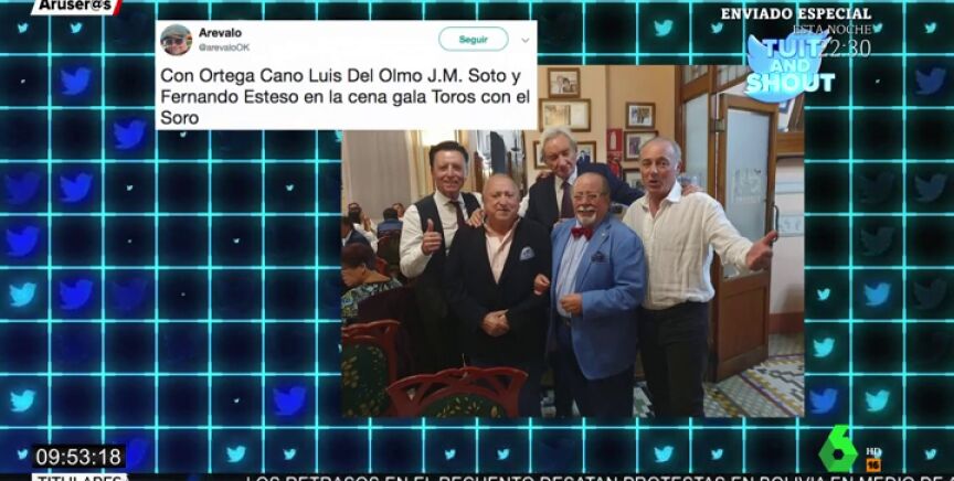 El cómico valenciano Arévalo ha revolucionado Twitter al publicar una imagen que se hizo durante la gala Toros con el Soro. En la instantánea aparece acompañado del torero José Ortega Cano, el periodista Luis del Olmo, el actor Fernando Esteso, y el cantante José Manuel Soto.